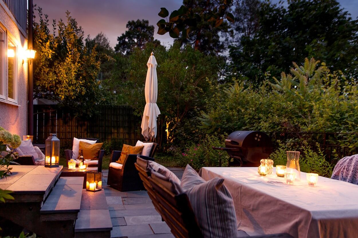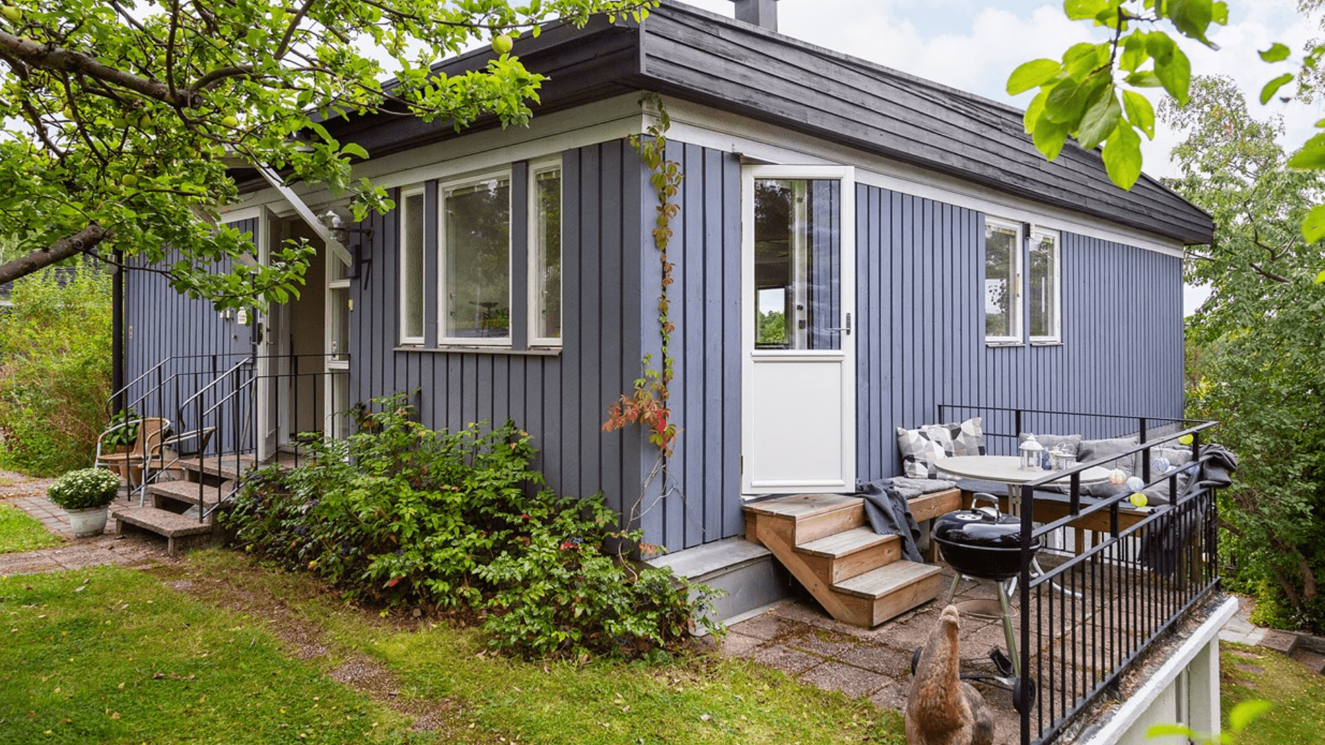Den gröna tomten är inbjudande och erbjuder plats för lek, odling och sociala stunder utomhus, en idealisk miljö för familjeliv och avkoppling.